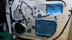 スピーカーの配線も、もし水が浸水しても大丈夫なように工夫されていました。スピーカー取り付け後、ケーブルもしっかりと固定されて右ドアは終了。