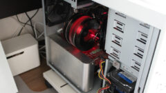 ケーブルを綺麗にするのかと思いきや、どうせいじるからとこれで作業は終了するそうな。SSD+HDD7発も積んでるので、物々しい~!